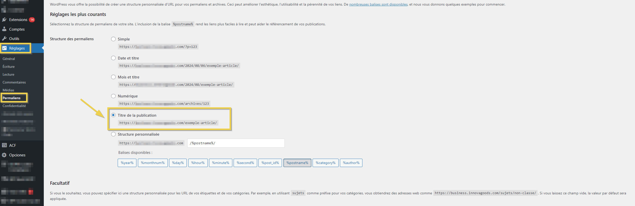 - Réglages → Liens permanents → Réglages courants et sélectionnez l’option Titre de la publication