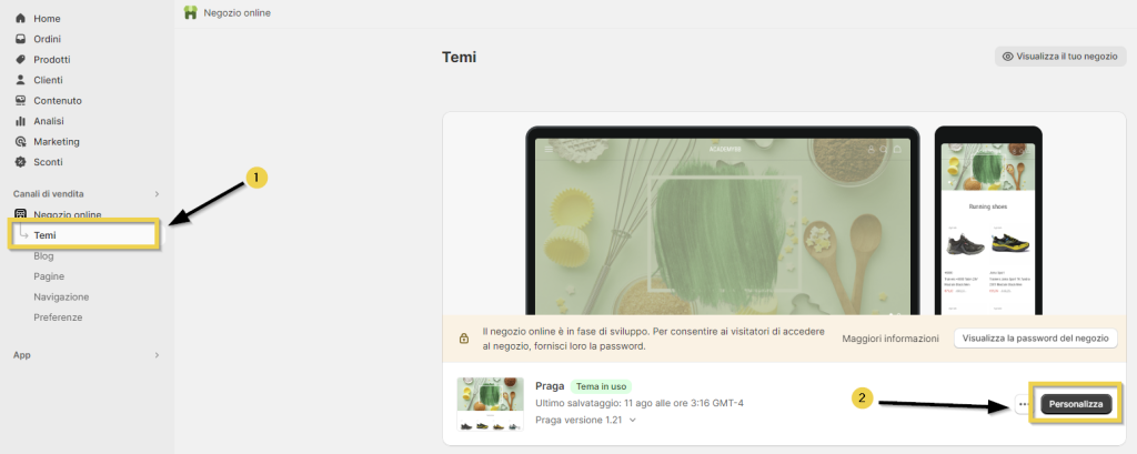 Accedere al pannello di controllo del negozio, cliccare sulla sezione Negozio online > Temi e, sul tema attivo, cliccare su Personalizza