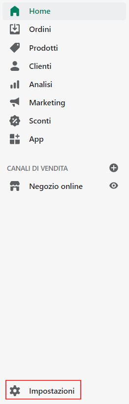 Per verificare il dominio attualmente configurato sul vostro negozio Shopify e modificare la configurazione, basta accedere alla sezione “Impostazioni” che si trova sul menù di sinistra, in basso.