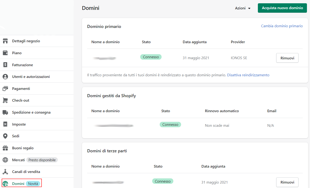 Sulla seguente documentazione ufficiale di Shopify, si trovano maggiori informazioni relative alla configurazione dei nomi di dominio su Shopify: https://help.shopify.com/it/manual/domains