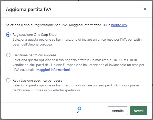 Nella sezione Impostare i vostri registri IVA di questo articolo di Shopify, avete maggiori informazioni su come completare ciascuna di queste opzioni.