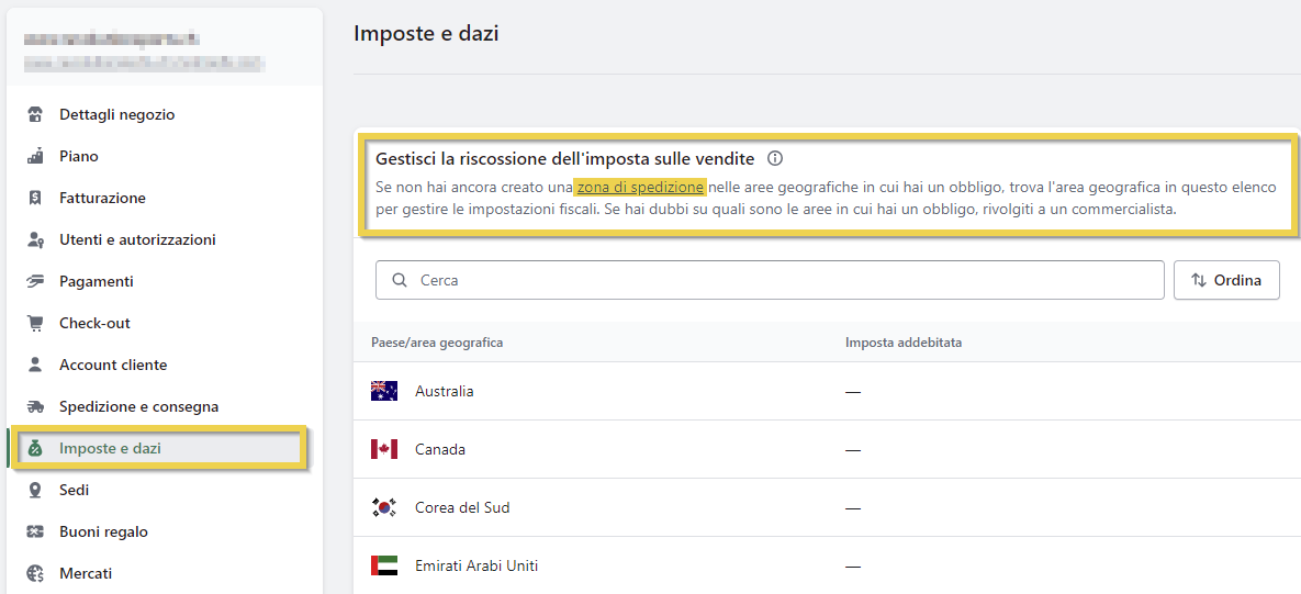 - Una volta create le zone, andare alla sezione Tasse e dazi del menù a sinistra.