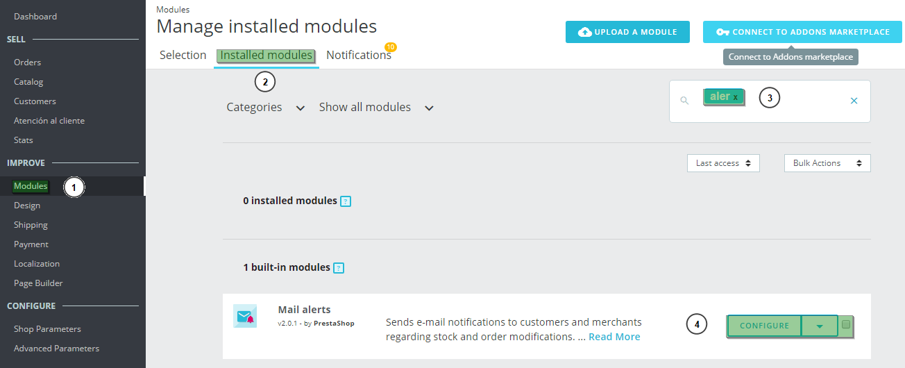 - Entrare in Moduli -> Moduli (1), nella sezione Moduli installati (3), su trova scrivere alert (3). Apparirà come risultato “Mail alerts”. Cliccare sul tasto Configura (4)