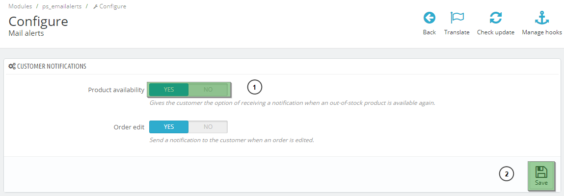 - Nella sezione Notificazioni del cliente, attiviamo la scelta “Disponibilità del prodotto” (1).
