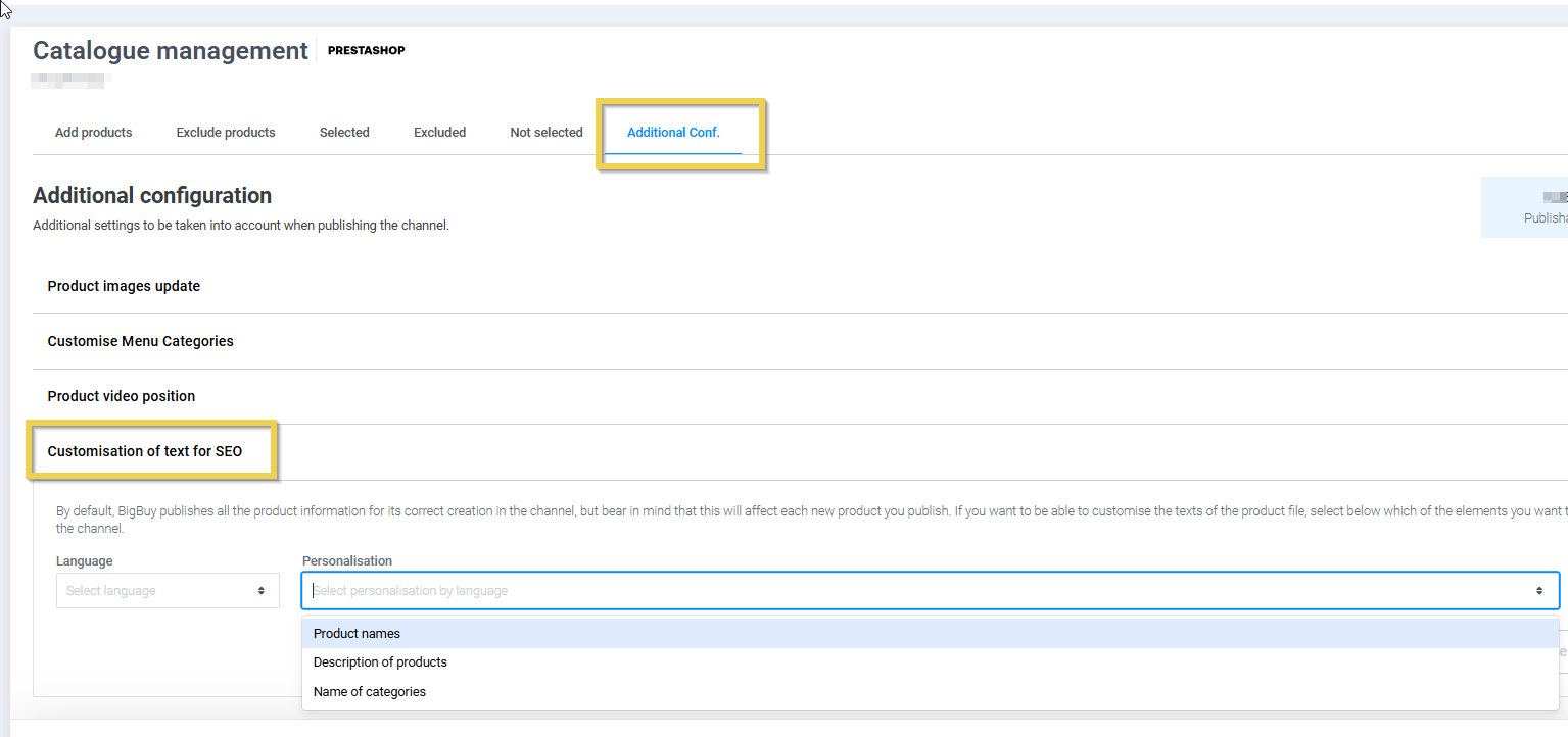 Dovrete selezionare se si vogliono mantenere, in ogni lingua, i nomi e le descrizioni dei prodotti, come anche i nomi delle categorie fornite da BigBuy. Tuttavia, se si desidera lasciare i propri testi, deselezionare le caselle corrispondenti in base alla lingua.