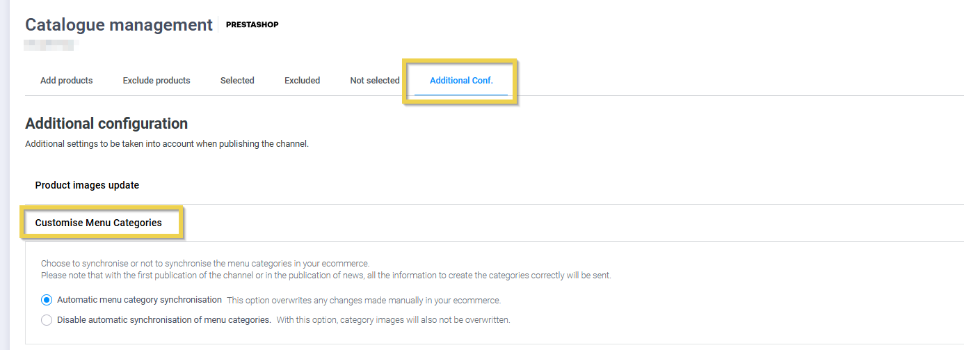 Se si vuole modificare l’albero delle categorie, bisogna selezionare la seconda opzione in modo che le modifiche non siano aggiornate dalla Multi-channel Integration Platform. Si prega di notare che se BigBuy ristruttura l’albero delle categorie e questa opzione è attiva, esse non saranno aggiornate. Questa opzione rispetterà le modifiche di categorizzazione realizzate nel proprio e-commerce, così come le categorie disattivate; nemmeno le immagini delle categorie saranno sovrascritte.