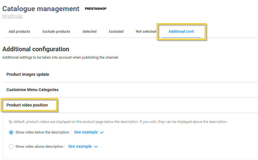 Questa sezione permette di selezionare in quale posizione della descrizione del prodotto verranno caricati i video, se presenti. Si può mostrare il video nella parte inferiore o superiore della descrizione del prodotto nel negozio.
