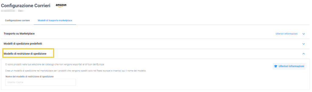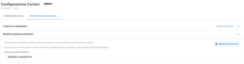 - In MIP immettere lo stesso nome assegnato al modello creato nel marketplace nella scheda Corrieri > Nome modello di spedizione.
