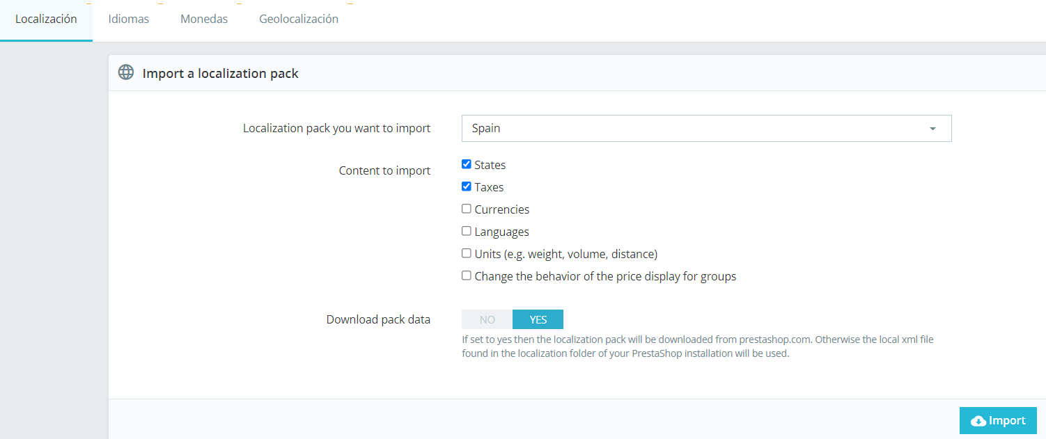 - Nella sezione localizzazione andare su Importare un pacchetto di localizzazione.