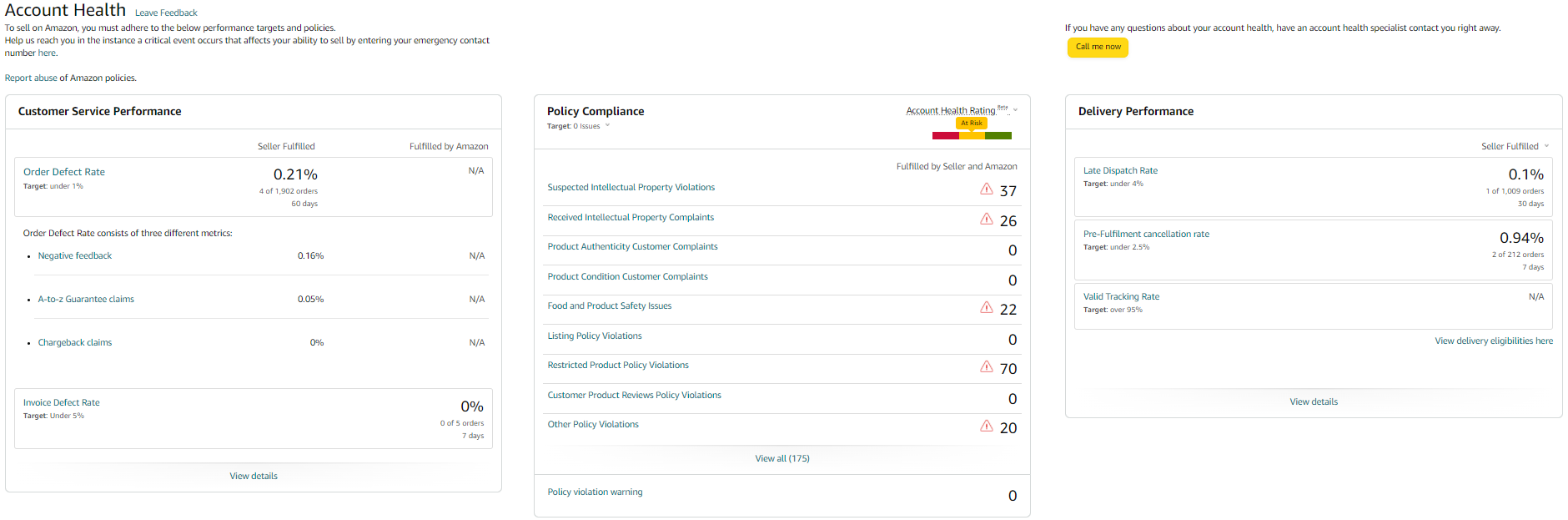 Su Amazon, ci riferiamo ai rapporti come “Prestazioni del venditore”. Vi si accede tramite il menu principale > Prestazioni > Stato dell’account.