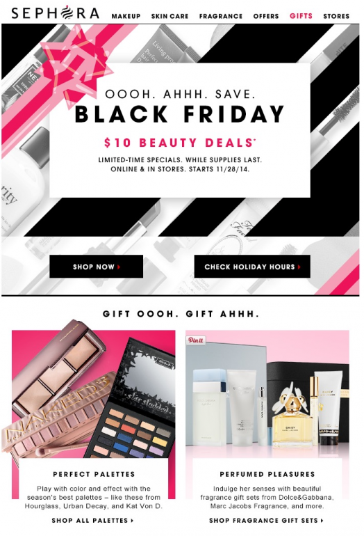 - Sephora: Una campagna di e-mail marketing molto suggestiva e attraente. La struttura è semplice, c’è equilibrio tra immagini e testo -non vorrai saturare di informazioni i tuoi clienti-, ha pulsanti di chiamata all’azione con colori in contrasto e si presenta chiaramente l’identità della marca.