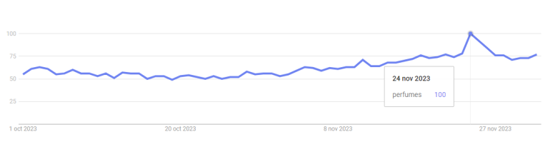 I profumi e i prodotti cosmetici diventano una delle categorie più ricercate durante il Black Friday, attirando i consumatori che vogliono approfittare delle migliori offerte sui loro marchi preferiti. Con una vasta gamma di opzioni e promozioni irresistibili, questa è un’ottima opportunità per incrementare le tue vendite nel settore della bellezza. Se osserviamo il comportamento dei consumatori durante il Black Friday del 2023, vediamo che la ricerca di questa categoria aumenta durante tutto il mese di ottobre e novembre, raggiungendo un picco il giorno stesso del Black Friday.