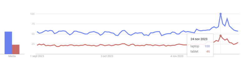 La categoria dell’ elettronica e dell’ informatica si posiziona come una delle più importanti durante il Black Friday, attirando un gran numero di consumatori alla ricerca delle ultime novità e delle migliori offerte. Con prodotti come TV, computer e dispositivi intelligenti ad alta domanda, questa è un’opportunità imperdibile per massimizzare le tue vendite. La ricerca di laptop e tablet aumenta durante tutto il mese di ottobre e novembre, come possiamo vedere nel seguente grafico di Google Trends: